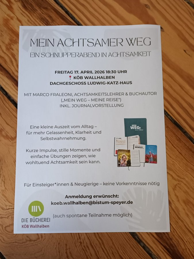 Anmeldungen sind erwünscht unter koeb.wallhalben@bistum-speyer.de, eine spontane Teilnahme ist auch möglich.