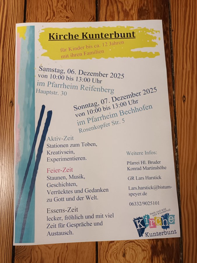 Das Team der Kirche Kunterbunt freut sich über viele Interessierte und Besucher. Weitere Infos sind bei unserem Gemeindereferenten Lars Harstick zu bekommen (lars.harstick@bistum-speyer.de, 06332-9025101).
