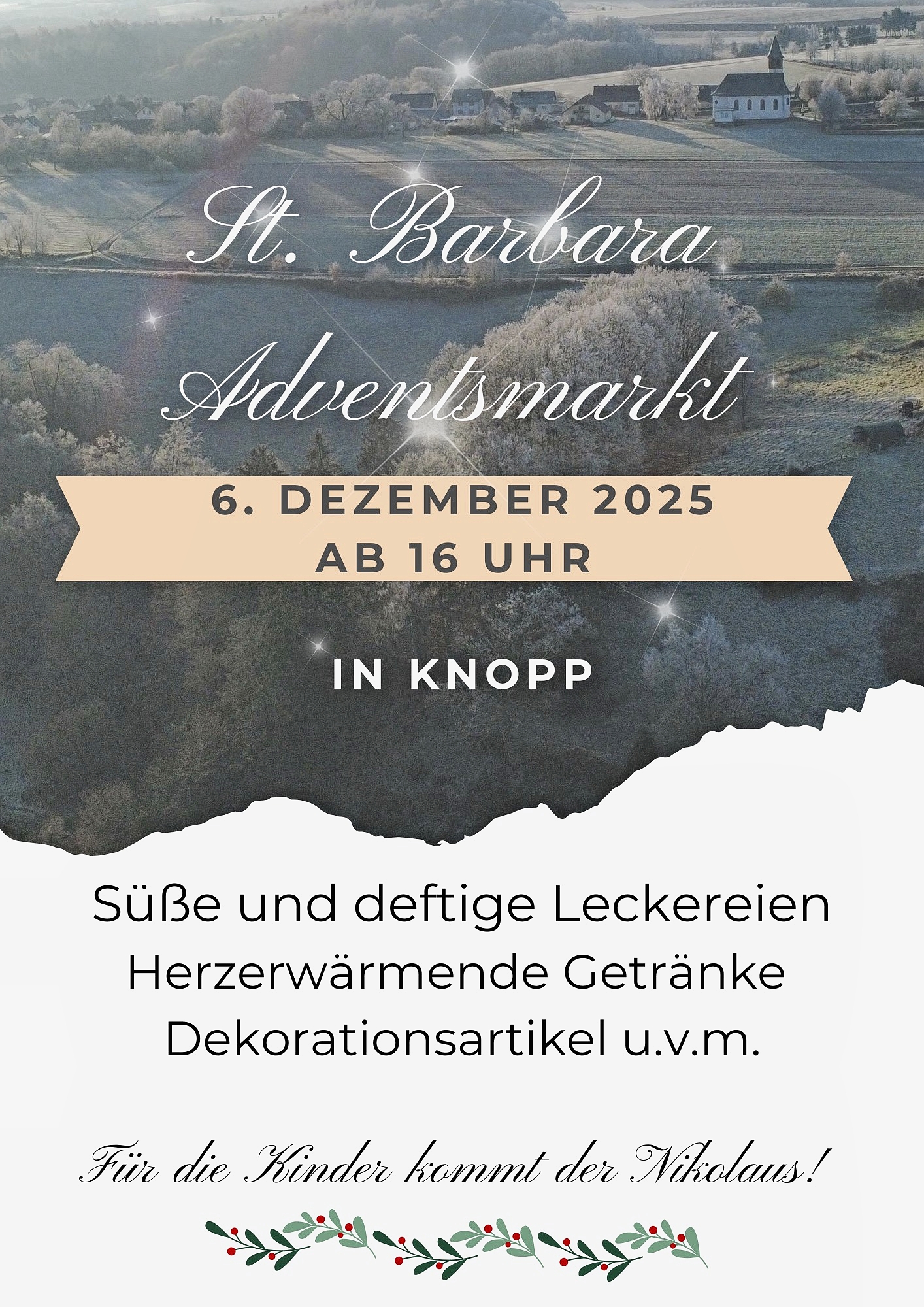 Am 6. Dezember ab 16 Uhr findet um die St. Barbara Kirche in Knopp der traditionelle Adventsmarkt statt. Den Besuchern werden verschiedene Leckereien und Getränke und auch Dekorationsartikel geboten. Für die kleinen Besucher kommt auch der Nikolaus. Wir freuen uns über zahlreiche Besucher.